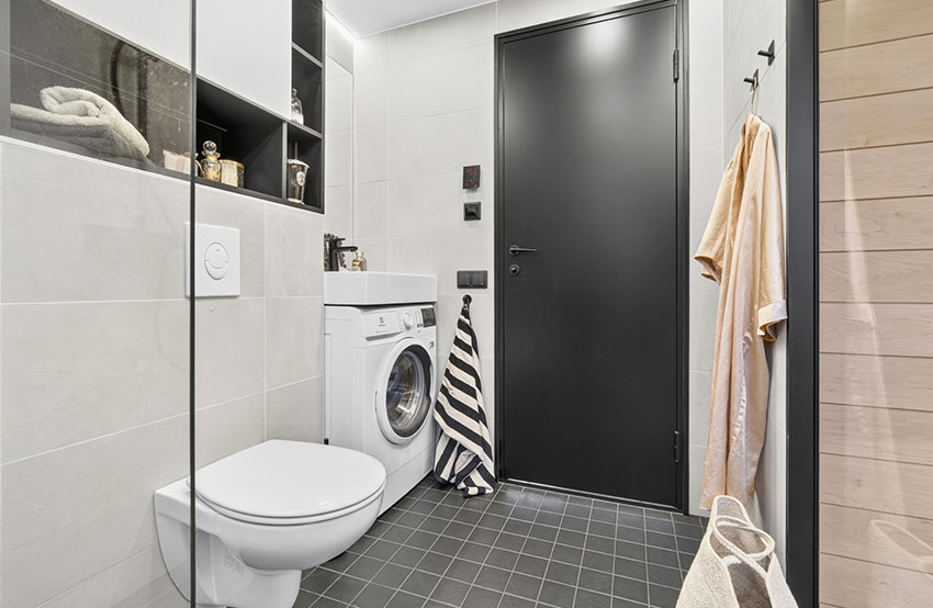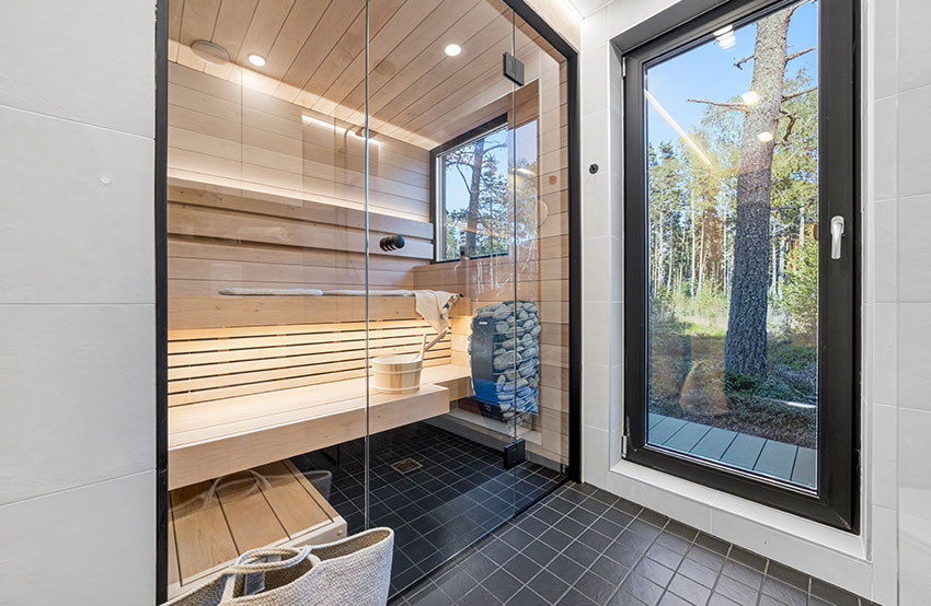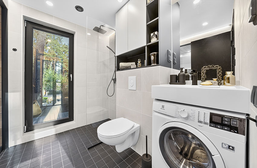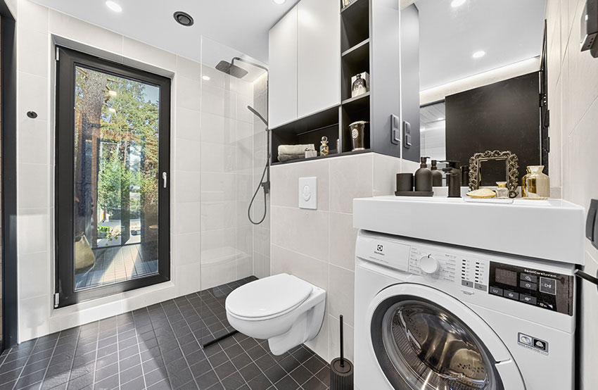 KODA houses come with fully finished bathrooms, thoughtfully designed for comfort and modern living. Each bathroom features a ventilation system, electric underfloor heating, LED lighting, and beautifully tiled walls. Standard sanitary fittings include a sink, mixers, a shower system, and a wall-hung toilet. To suit your aesthetic, mixers are available in elegant chrome or sophisticated black finishes.