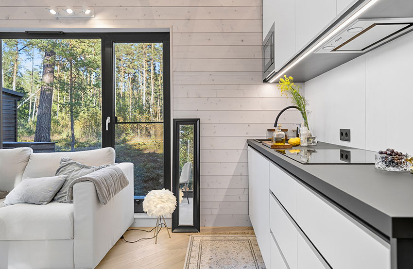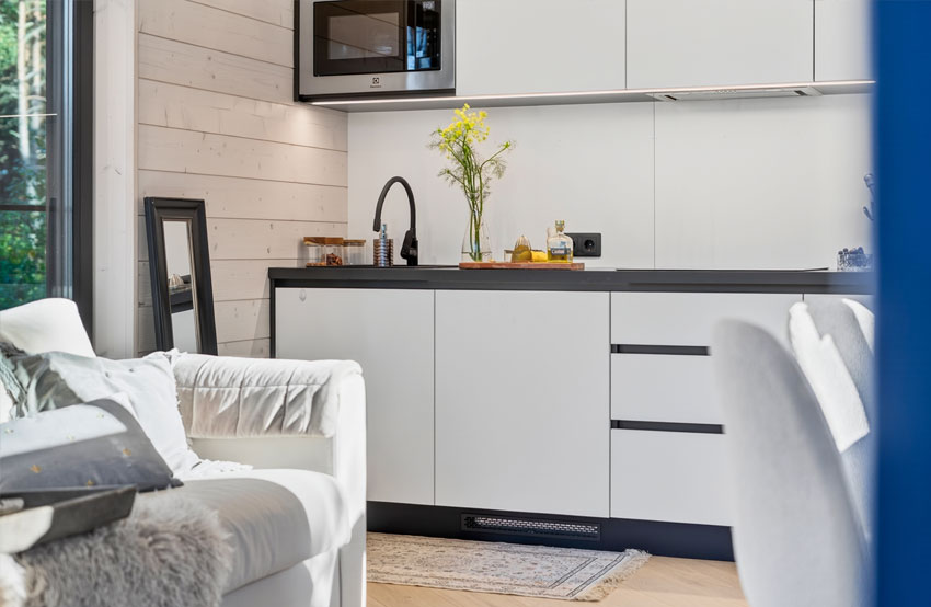 KODA in standard equipment comes with kitchen readiness – so you have more options to choose from. You can either buy your kitchen cabinetry from IKEA or ask a local carpenter to make a tailored to your needs kitchen furniture.