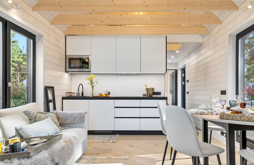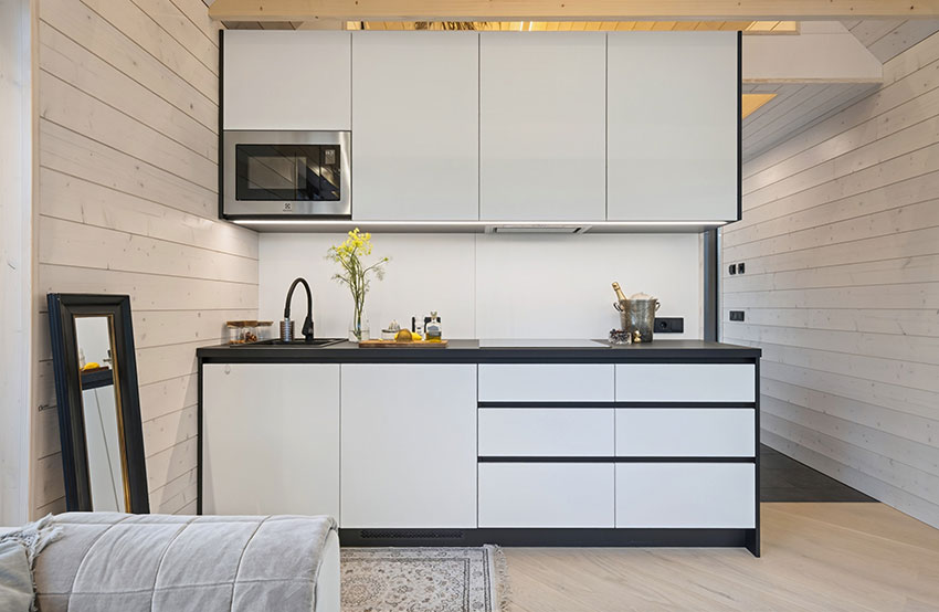 Kitchen cabinets Painted smooth wooden boards (white and black) on walls
