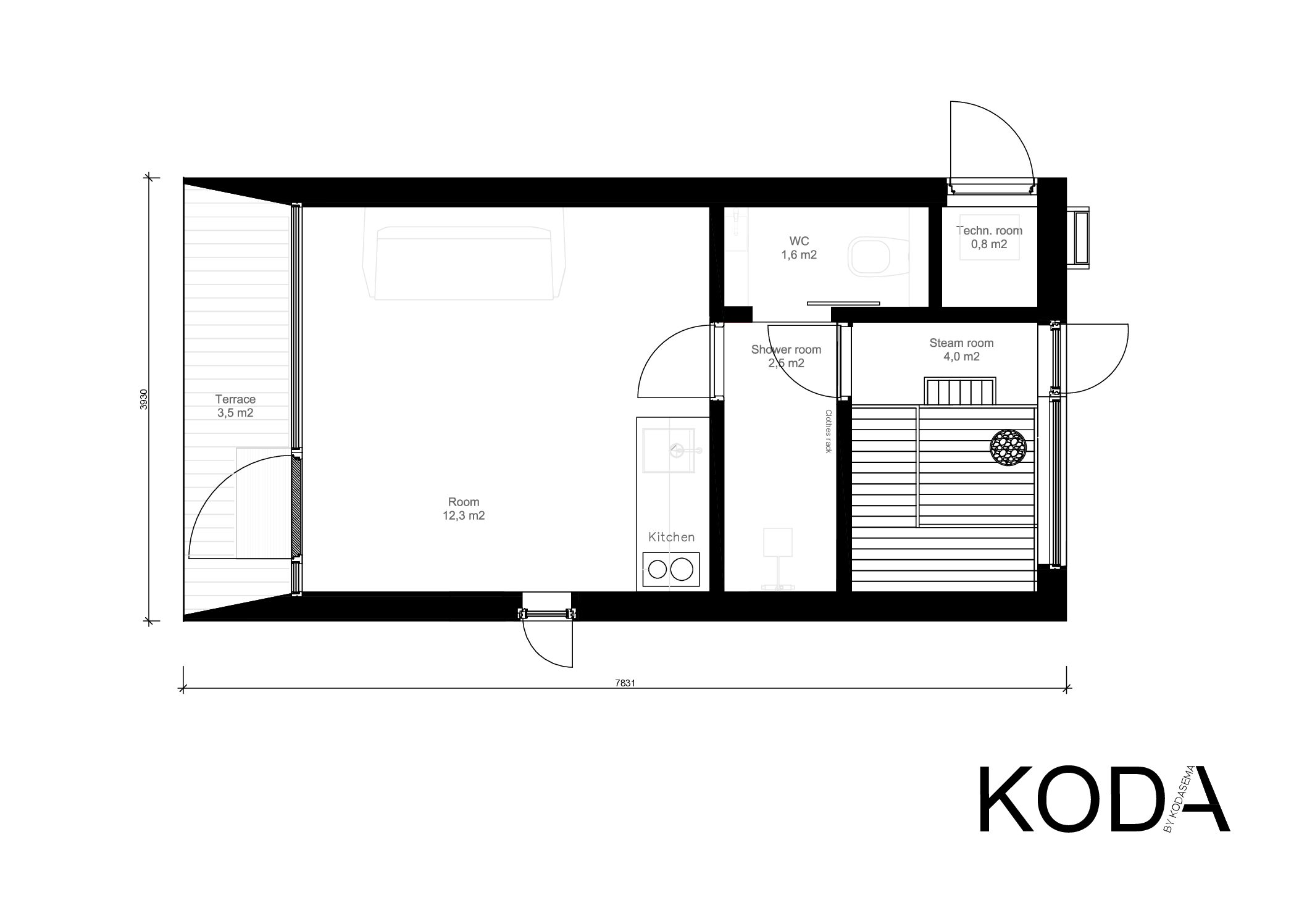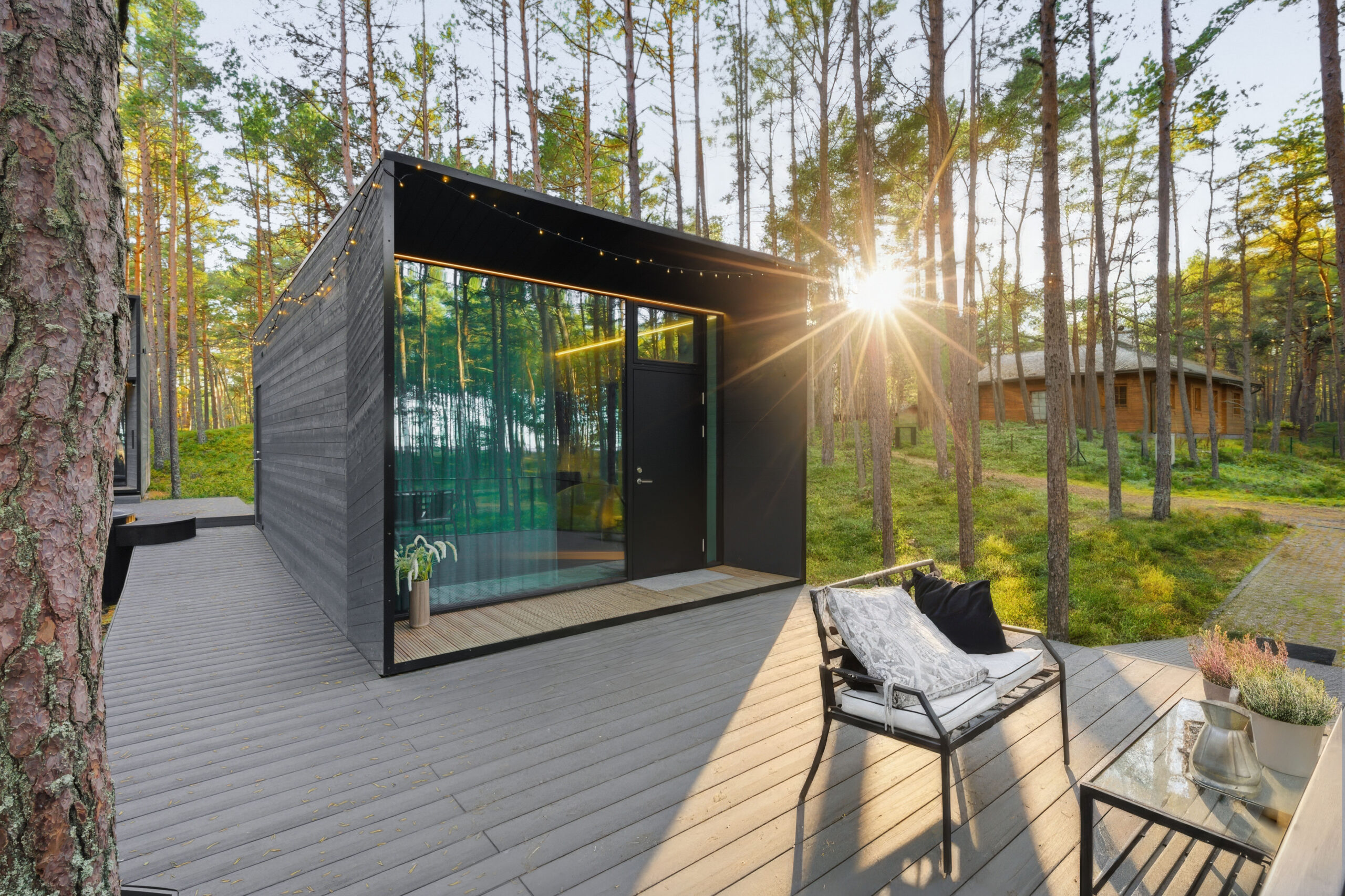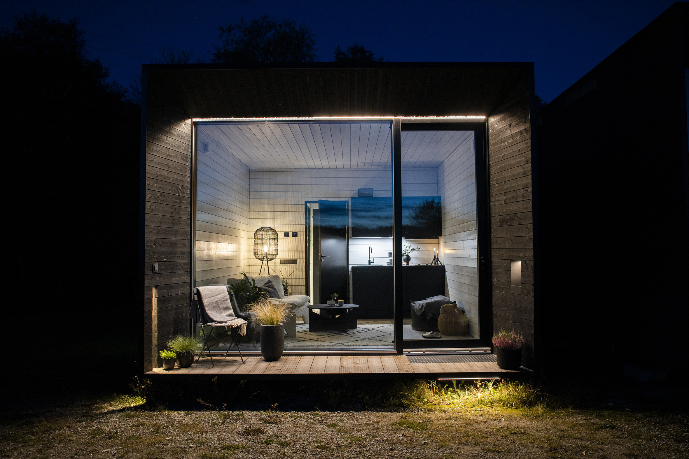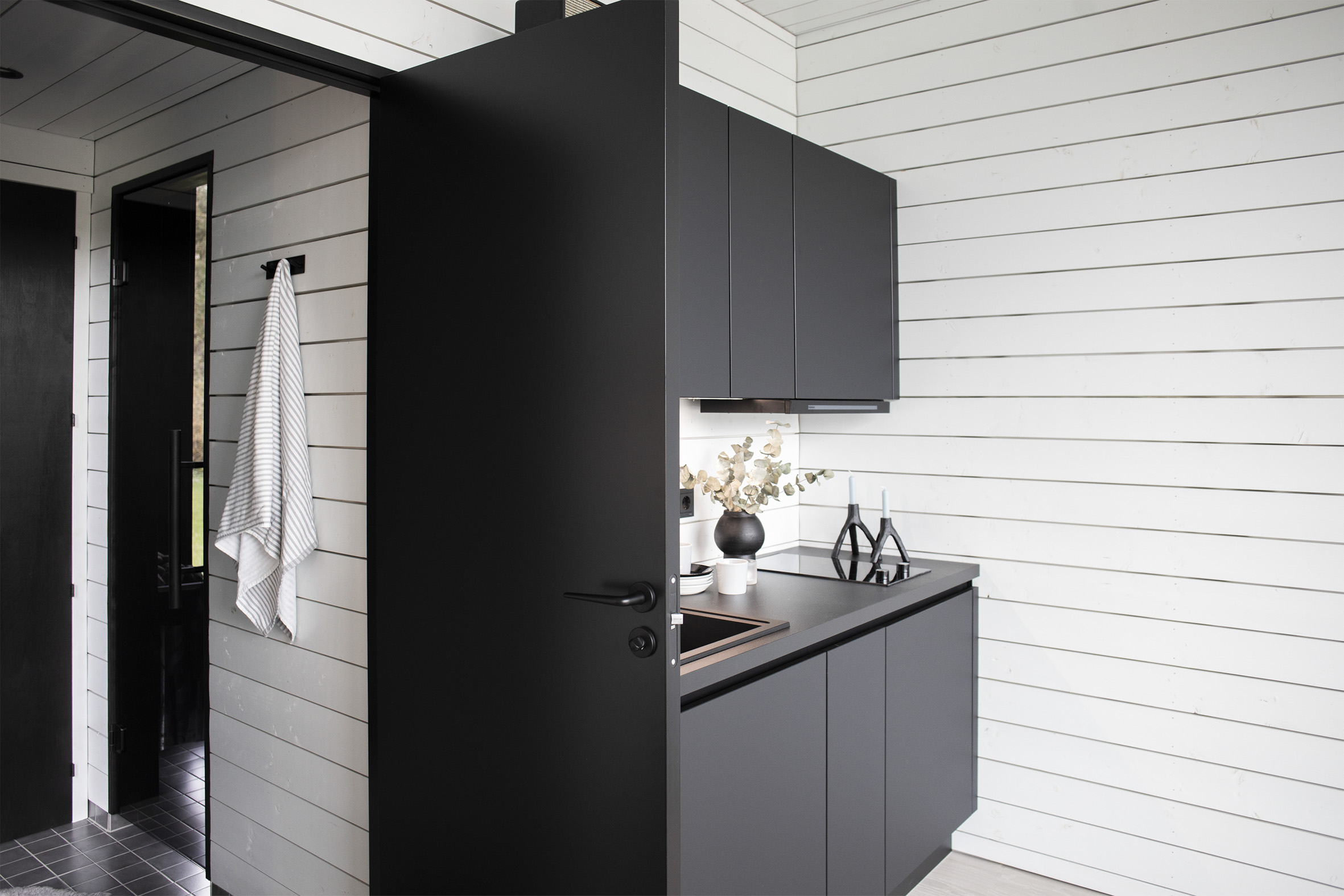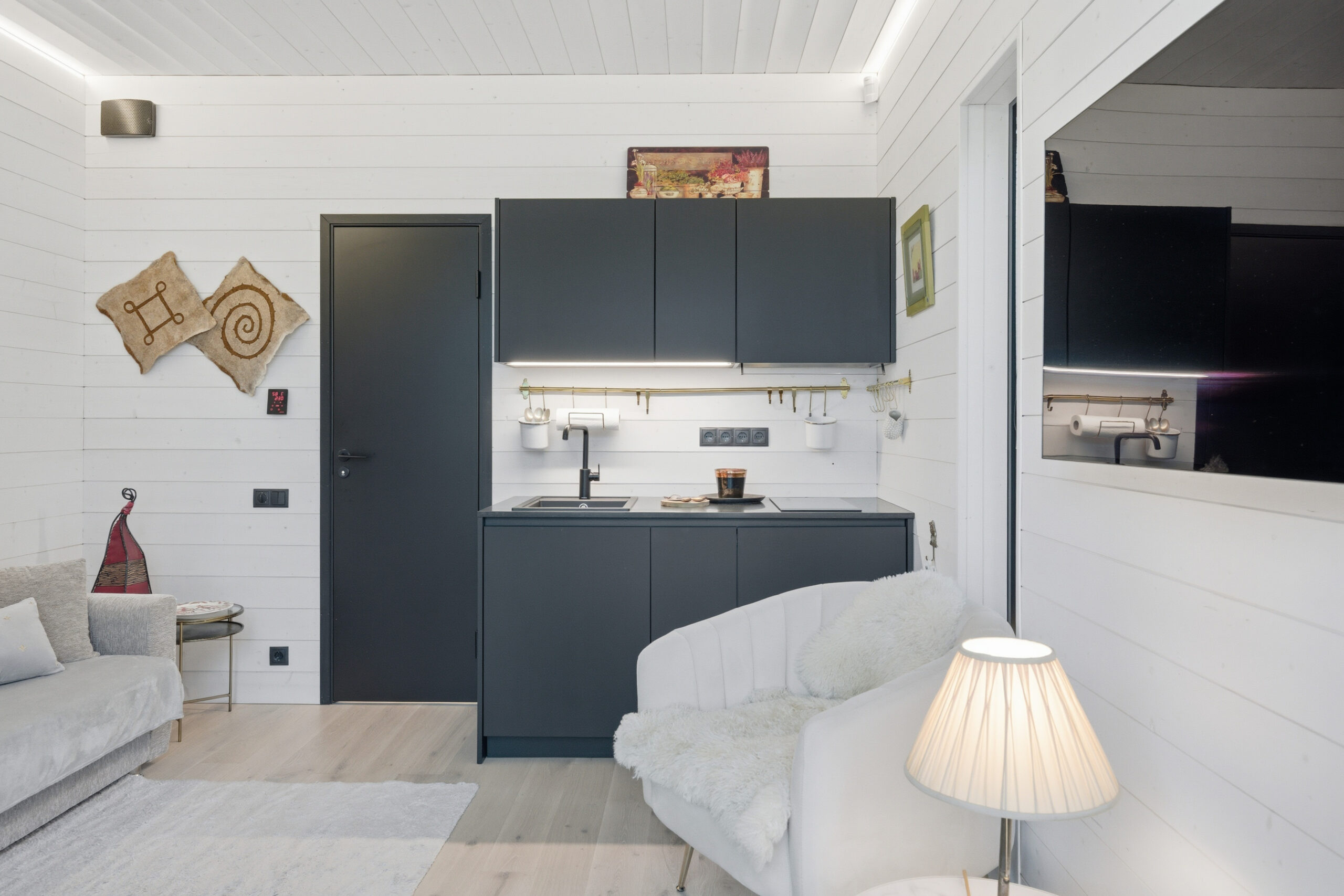 Our modern and stylish compact sauna is built for design conscious clients. Sanctuary of warmth and calm, perfect for rewinding, relaxing and meditation, a place to treat your soul and body. Enhanced from our Compact series tiniest model, perfected with a sauna section to offer home SPA experience for you and your friends. In livingroom you will find a compact and stylish kitchenette and enough space for cozy lounge with spectacular view from ceiling to floor window in the front. Mineral wool insulation, electrical floor heating and triple glazed windows in standard configuration keep you comfy in low as well as high outside temperatures.