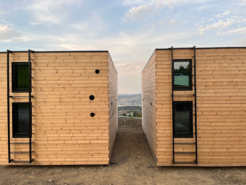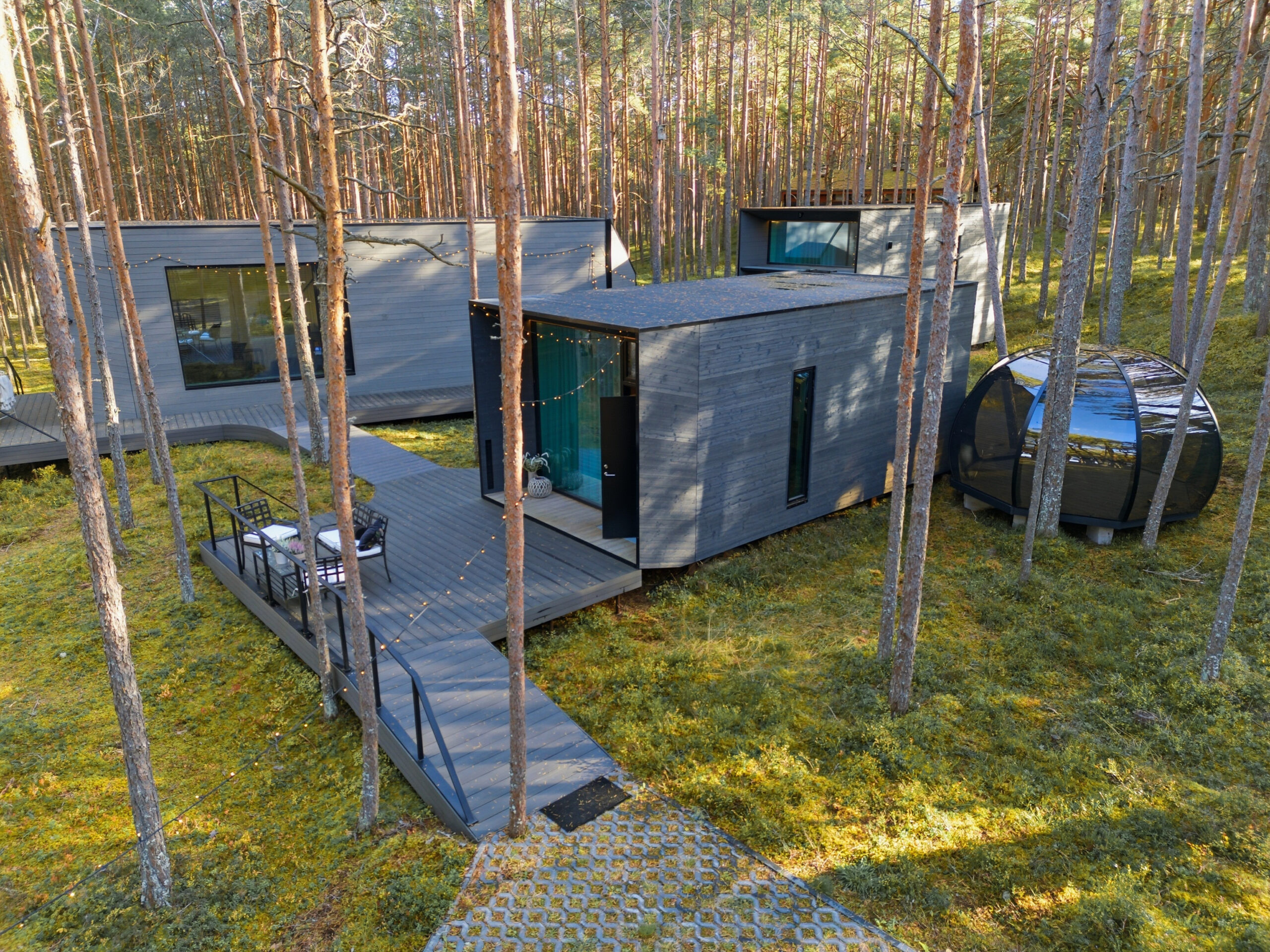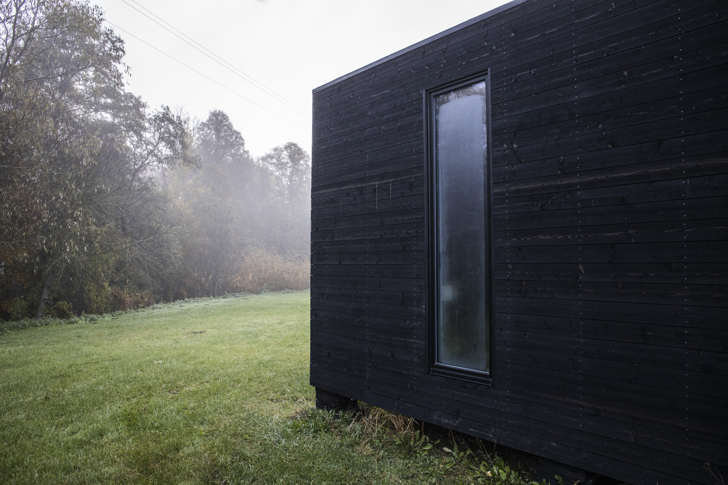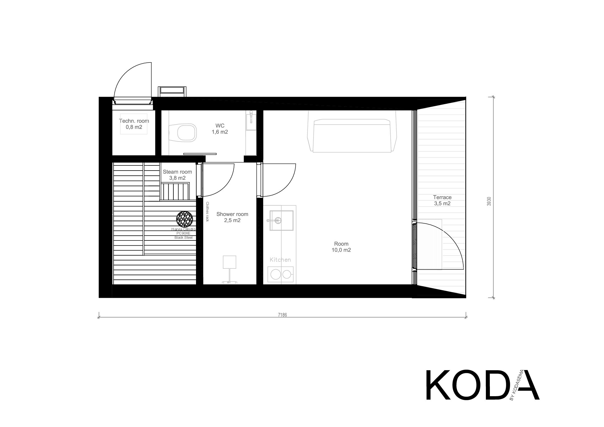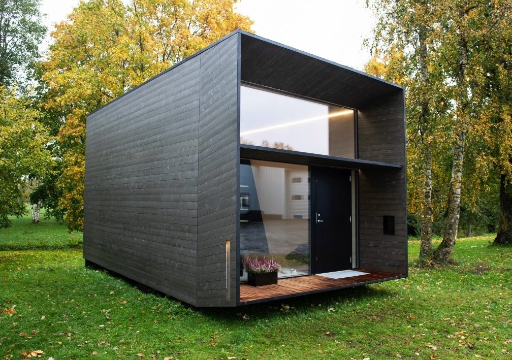 Our modern and stylish compact sauna is built for design conscious clients. Sanctuary of warmth and calm, perfect for rewinding, relaxing and meditation, a place to treat your soul and body. Enhanced from our Compact series tiniest model, perfected with a sauna section to offer home SPA experience for you and your friends. In livingroom you will find a compact and stylish kitchenette and enough space for cozy lounge with spectacular view from ceiling to floor window in the front. Mineral wool insulation, electrical floor heating and triple glazed windows in standard configuration keep you comfy in low as well as high outside temperatures.