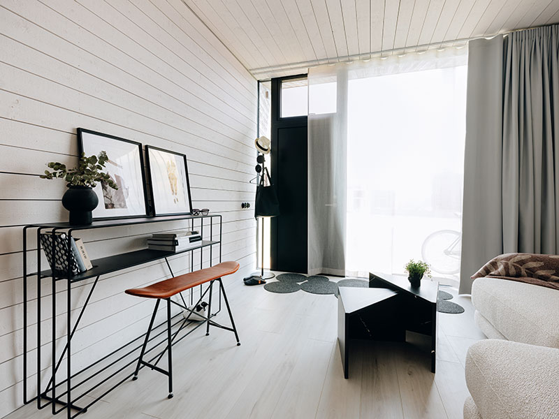 Year round living is enabled by the mineral wool insulation and electrical floor heating and triple glazed windows in standard configuration.